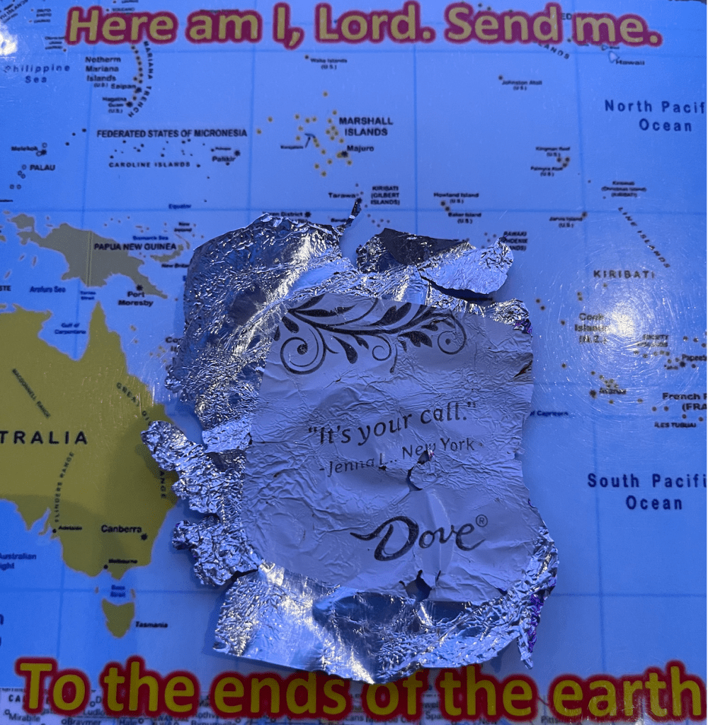 Dove dark chocolate with almonds is my favorite, but I rarely buy them. I want to maintain a healthy weight and I don’t want to spend the money for it. It’s a treat. I bought some to share at our conference booth. Just as I finished packing the last of our materials I opened one of the remaining chocolates to eat. The message inside read, “It’s your call.”